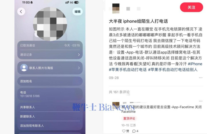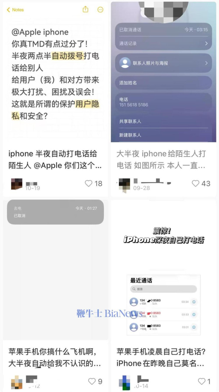 10月31日,近日,多名iPhone用户发帖表示,手机在锁屏状态下大半夜自动拨号,对象多为陌生人或最近联系人。